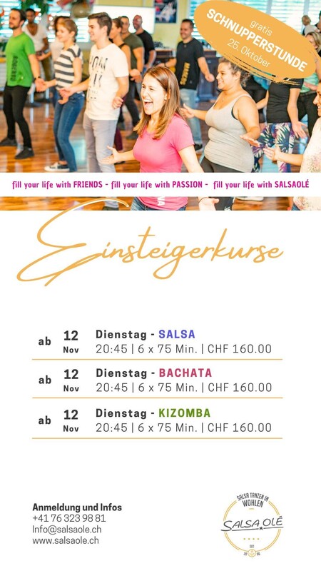 Wir sind überzeugt: Salsa ist lernbar! Du bringst jede Menge Freude an Tanz und Musik sowie eine Prise Geduld mit, wir liefern dir ein gut durchdachtes und funktionierendes Konzept. Egal ob jung oder alt, Anfänger oder Fortgeschritten, Salsa, Bachata oder Kizomba, in unseren regulären Kursen und Workshops bieten wir für jedes Bedürfnis etwas Passendes! Salsa ist sicher die grösste unserer Leidenschaften und wir lieben und beherrschen jeden der 3 populärsten Salsa Stile gleichermassen. Jeder hat seinen Reiz und lässt dich die Musik auf verschiedene Weise interpretieren, weshalb wir alle drei Stile unterrichten und fördern. Für diesen Einsteigerkurs benötigst du keine Vorkenntnisse und wir freuen uns, dir das Tanzen Schritt für Schritt beizubringen :) www.salsaole.ch