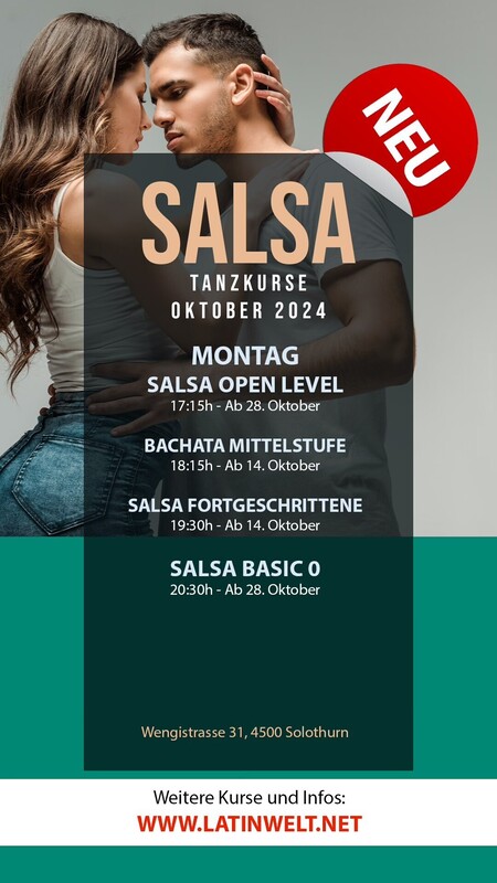 NEU! AB 14. OKTOBER 2024 Mo 14.10.2024 - 02.12.2024 | 19:30 - 20:25 Uhr OKT: 14., 21., 28. // NOV: 4., 11., 18., 25. // DEZ: 2. SALSA FORTGESCHRITTENE Kurs findet statt! Kurs-Nr. 2410-004 - Salsa Cubana 8x 55 Minuten | CHF 200 Max. Teilnehmer: 20 Personen | Kursstart ab 6 Einschreibungen Kursleitung: Segundo Valencia // Ort: Latinwelt Solothurn NOTE: Man kann auch ohne festen Tanzpartner am Kurs teilnehmen. >>> ANMELDUNG <<< Genügend freie Plätze!