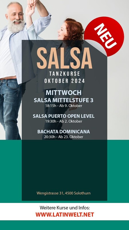 NEU! AB 23. OKTOBER 2024 Mi 23.10.2024 - 11.12.2024 | 20:30 - 21:25 Uhr BACHATA DOMINICANA OPEN LEVEL Kurs-Nr. 2410-010 // Für Anfänger mit oder ohne Vorkenntnisse 8x 55 Minuten | CHF 200 Max. Teilnehmer: 20 Personen | Kursstart ab 6 Einschreibungen Kursleitung: Segundo Valencia // Ort: Latinwelt Solothurn NOTE: Man kann auch ohne festen Tanzpartner am Kurs teilnehmen. In diesem Tanzkurs lernt der Schüler entsprechend seinem Niveau und seinem Lerntempo. Egal, ob mit oder ohne Vorkenntnisse – in unserem Kurs für Bachata lernen Sie Tanzstile voller Leidenschaft, Energie und Vielfalt, die Ihr Leben bereichern werden. MEHR INFORMATION >>> ANMELDUNG <<< Genügend freie Plätze!