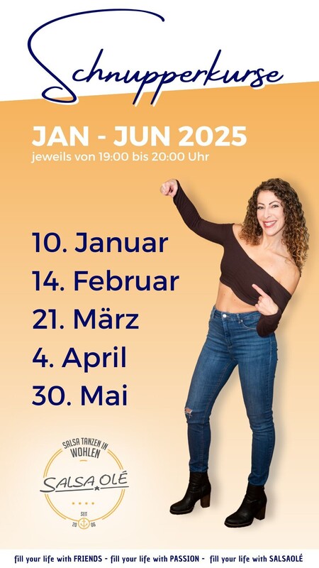 𝐒𝐀𝐋𝐒𝐀, 𝐁𝐀𝐂𝐇𝐀𝐓𝐀 𝐮𝐧𝐝 𝐊𝐈𝐙𝐎𝐌𝐁𝐀 𝐏𝐫𝐨𝐛𝐞𝐥𝐞𝐤𝐭𝐢𝐨𝐧𝐞𝐧 Komm vorbei, nimm deine Freunde, Family, Nachbarn & Co. mit und probier es einfach aus - kostenlos und unverbindlich! Hat es dir gefallen, können wir gleich anschliessend mit dir unser aktuelles Kursprogramm anschauen, wir finden bestimmt eine passende Einstiegsmöglichkeit! Diese Probelektionen finden IMMER statt! Wir freuen uns auf dich! https://salsaole.ch/
