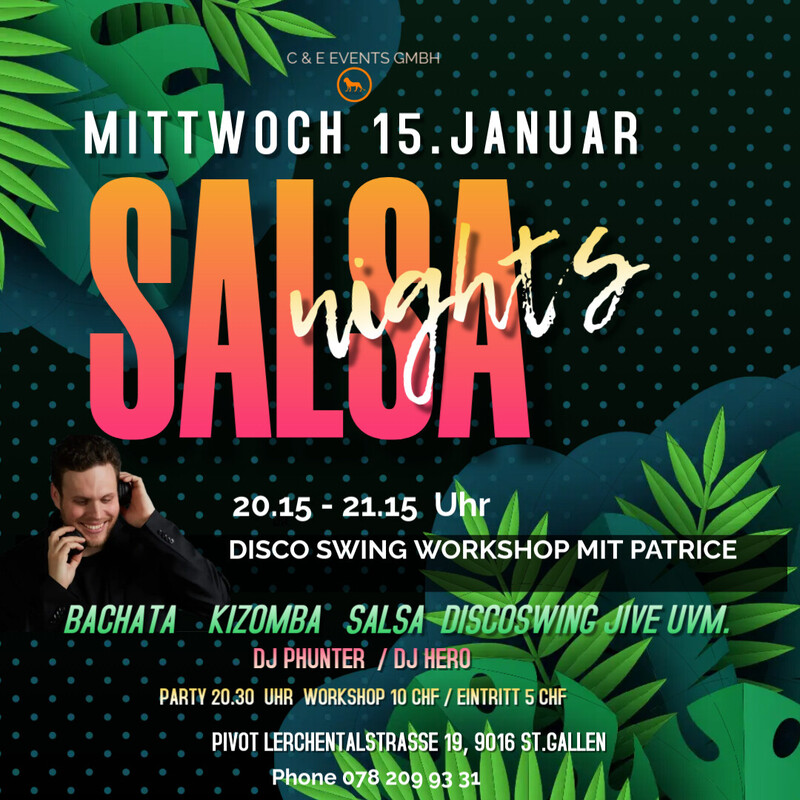Lasst uns abtanzen und das Leben feiern am Mittwoch den15.Januar mit DJ Phunter in St.Gallen im Pivot 🙂 Special: Disco Swing Workshop mit Patrice von 20.15. - 21.15 Uhr Workshop 10 CHF / Eintritt 5 CHF Anmeldung unter: Für weiter Auskünfte: Phone 078 209 93 31 oder per Mail an info@ce-events.ch Wir freuen uns auf einen schönen Abend mit Euch! https://ce-events.ch