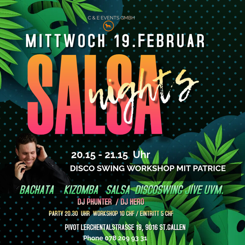 Lasst uns abtanzen und das Leben feiern am Mittwoch den 19.Februar mit DJ Phunter in St.Gallen im Pivot 🙂 Special: Disco Swing Workshop mit Patrice von 20.15. - 21.15 Uhr Workshop 10 CHF / Eintritt 5 CHF Anmeldung unter: Für weiter Auskünfte: Phone 078 209 93 31 oder per Mail an info@ce-events.ch Wir freuen uns auf einen schönen Abend mit Euch! https://ce-events.ch