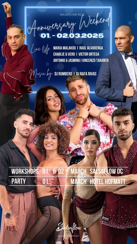 Wir feiern unseren siebenjährigen Geburtstag und möchten auch dieses Jahr mit Euch feiern und organisieren daher eine Party und ein Workshop Weekend am 1. und 2. März 2025 ! Da wir immer wieder mit weltbekannten TänzerInnen arbeiten, werden wir einige von ihnen an diesem Wochenende erneut bei uns Willkommen heissen. Freue Dich auf eine einzigartige Party mit tollen Shows & mega DJ's, sowie bombastischen Workshops, welche das Wochenende abrunden. Kalendereintrag gemacht? Wir freuen uns auf Dich! https://www.salsaflow-dc.com/spezialprogramm/salsaflow-s-jubil%C3%A4um-weekend/workshops/