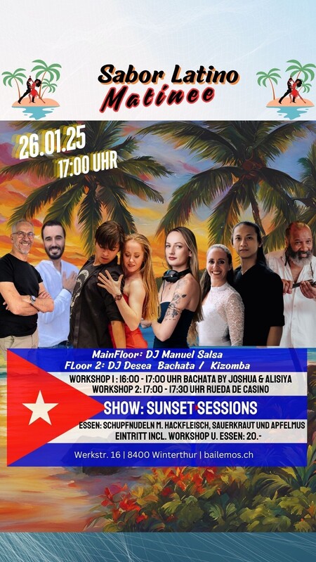 SABOR LATINO MATINEE, seit über 10 Jahren die Party am Sonntagnachmittag für alle die Salsa, Bachata und Kizomba lieben. Hast du Lust auf eine Salsa, Bachata und Kizomba-Party, die dich zum Schwitzen bringt? Dann komm zum Sabor Latino Matinee! Hier gibt es nicht nur einen, sondern gleich zwei Dancefloors, auf denen du zu den heißen Rhythmen unserer DJ`s das Tanzbein schwingen kannst. Aber bevor du dich in das Party-Getümmel stürzt, hast du die Möglichkeit, bei einem Workshop deine Tanz-Skills zu verbessern. Unsere professionellen Tanzlehrer werden dir zeigen, wie du dich elegant auf dem Parkett bewegst und dabei eine Menge Spaß hast. Danach darfst du dein Können beim Rueda ausprobieren und dein Glück beim Tanzen in der Gruppe versuchen. Und wenn du zwischendurch eine Pause brauchst, kannst du Dir an der Bar einen feinen Cocktail gönnen und um 18:30 Uhr von den köstlichen Düften eines feinen Menus von unserem Kochverein el Tipico verführen lassen. Also komm vorbei und verbringe eine unvergessliche Zeit mit uns auf der Sabor Latino Matinee! Floor 1 DJ Manuel mit Salsa Floor 2 DJ Desea Bachata | Kizomba Liveact: Sunset Session Essen: Schupfnudeln mit Beilagen 2 Workshops: 16:00 – 17:00 Uhr Bachata Workshop mit Joshua & Alisiya 17:00 – 17:30 Uhr Rueda mit Franz Vor dem Sabor Latino stehen genügend gratis Parkplätze zur Verfügung. Anreise mit dem Auto: Wegbeschreibung: An – Abreise mit dem ÖV bis Werkstr. 16: Zum Fahrplan https://saborlatino.ch/events/sabor-latino-matinee-am-sonntagnachmittag/