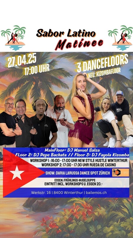 SABOR LATINO MATINEE, seit über 10 Jahren die Party am Sonntagnachmittag für alle die Salsa, Bachata und Kizomba lieben. Hast du Lust auf eine Salsa, Bachata und Kizomba-Party, die dich zum Schwitzen bringt? Dann komm zum Sabor Latino Matinee! Hier gibt es nicht nur einen, sondern gleich zwei Dancefloors, auf denen du zu den heißen Rhythmen unserer DJ`s das Tanzbein schwingen kannst. Aber bevor du dich in das Party-Getümmel stürzt, hast du die Möglichkeit, bei einem Workshop deine Tanz-Skills zu verbessern. Unsere professionellen Tanzlehrer werden dir zeigen, wie du dich elegant auf dem Parkett bewegst und dabei eine Menge Spaß hast. Danach darfst du dein Können beim Rueda ausprobieren und dein Glück beim Tanzen in der Gruppe versuchen. Und wenn du zwischendurch eine Pause brauchst, kannst du Dir an der Bar einen feinen Cocktail gönnen und um 18:30 Uhr von den köstlichen Düften eines feinen Menus von unserem Kochverein el Tipico verführen lassen. Also komm vorbei und verbringe eine unvergessliche Zeit mit uns auf der Sabor Latino Matinee! Floor 1 DJ Manuel mit Salsa Floor 2 DJ Pepe Bachata | Kizomba Floor 3: DJ Fayola Liveact: Daria Larussa / Dancespot Zürich Essen: Frühlings-Nudelsuppe 2 Workshops: 16:00 – 17:00 Uhr New Style Hustle Winterthur 17:00 – 17:30 Uhr Rueda mit Franz Vor dem Sabor Latino stehen genügend gratis Parkplätze zur Verfügung. Anreise mit dem Auto: Wegbeschreibung: An – Abreise mit dem ÖV bis Werkstr. 16: Zum Fahrplan https://saborlatino.ch/events/sabor-latino-matinee-am-sonntagnachmittag/