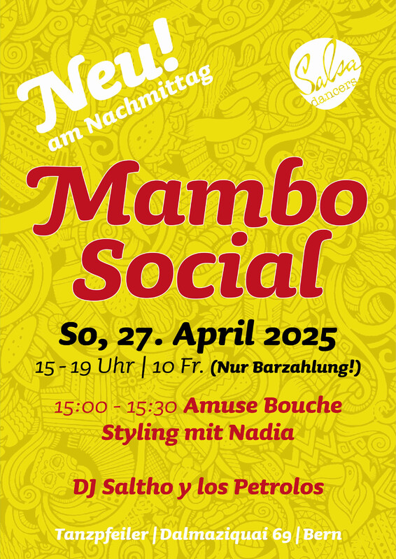 Die neue Partyreihe! Ab sofort gibt es zweimal im Monat unsere Socials – einmal Donnerstags am Abend und einmal Sonntags am Nachmittag. Lass den Alltag hinter dir, tanze dich durch den Tag und starte frisch und energiegeladen in die neue Woche. Wenn du deinen Sonntagnachmittag tanzend verbringen möchtest, bist du bei uns genau richtig! Jeweils von 15:00 - 15:30 findet jedesmal ein anderen Amuse Bouche Kurs Statt. Alle Infos dazu sind auf dem aktuellen Flyer ersichtlich
