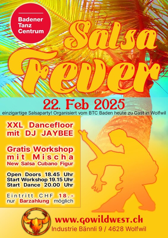 Das Badener Tanzcentrum lädt herzlich ein zur Salsa-Fever Party nach Wolfwil ins GoWildWest. Die XXL Tanzfläche und unser DJ JAYBEE sorgt für eine heisse Tanzparty mit Salsa, Bachata, Cha Cha Cha und Kizomba Musik. Dazu gibt es Drinks von unserem Barman Angi an unserer CubaBar. Kommt doch auch!