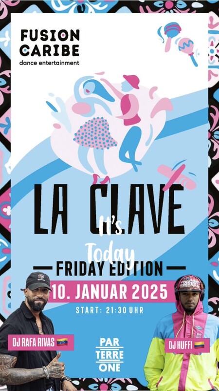 LA CLAVE NEU: FRIDAY EDITION ​ Heisse Rhythmen und lateinamerikanische Lebensfreude erwarten dich im Parterre One. Tanze zu heissen Salsa-Rhythmen, Timba, Bachata, Son Cubano, Reggaeton, Reparto und mehr. Diese Nächte versprechen Leidenschaft und pure Tanzfreude! ​​ ​ NEU im PARTERRE ONE! 1 x Mal im Monat freitags - Friday Edition Freitag, 10. Januar 2025 mit DJ RAFA RIVAS (Venezuela) & Special Guest DJ HUFFI (Colombia) 21:30 Uhr - circa 02:30 Uhr Eintritt: 15.- CHF (Cash oder Twint) ​ LA CLAVE wird präsentiert von „Katja Savastano - Fusión Caribe Dance Entertainment“ in Zusammenarbeit mit Parterre One Music. https://www.fusioncaribe.com/events https://www.fusioncaribe.com/events