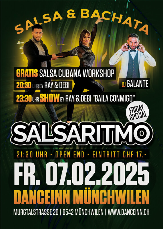 🔥★SALSARITMO★🔥 Die von Tänzer/innen beliebte SALSA & BACHATA Party der Ostschweiz🥳. Geniesse das einzigartige Ambiente und die tolle Stimmung im Dance Inn Münchwilen💃🏻🕺🏾🔥.. 🔘20:30H - 21:30H Gratis SALSA CUBANA Workshop by RAY & DEBI💃🏻🕺🏾👌 🔘21:30H - Open End, Party & Tanzen bis in die Morgenstunden🥳.. 🔘23:30H SHOW by RAY & DEBI "Baila Conmigo“💥 🔘DJ: GALANTE🎧 Wir freuen uns auf einen coolen SALSA "Cubana" Workshop und eine Super SHOW🥰..
