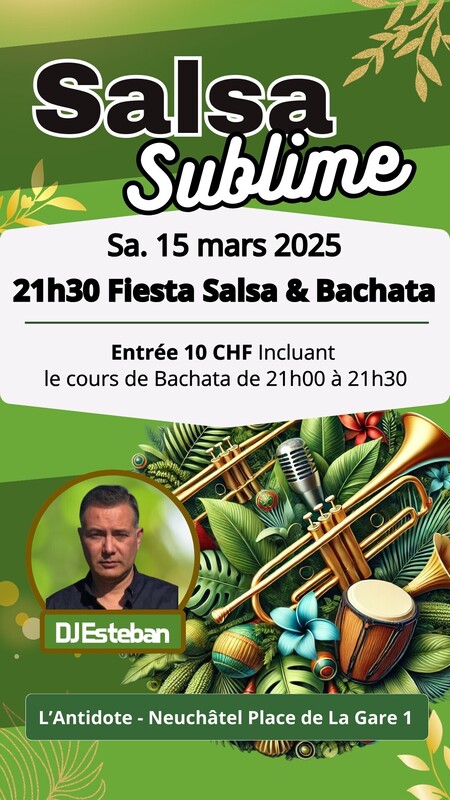 🔥 Les meilleures musiques de salsa, bachata y más avec DJ Esteban & Friends ! 💃 Inclus dans l’entrée 10 CHF : Workshop de 21h00 à 21h30 À partir de minuit, entrée 5 CHF ✨ Cocktails savoureux. Esteban & L'Antidote ✅ Événement sur Facebook ➡ https://fb.me/e/7GDWU5X9z