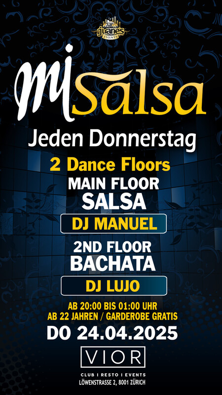 ► MI SALSA ◄ Jeden Donnerstag 2 Floors URBANVIOR Club by Juanes DOONERSTAG 24. APRIL 2025 ••• ► MAIN FLOOR: SALSA ALLSTYLES DJ MANUEL • Salsa Allstyles - Cubana - Clasica - Puertorriqueña •••• ► 2ND FLOOR: BACHATA DJ LUJO • Bachata Moderna, Fusion, Clasica y del Recuerdo. ••• • AB 22 JAAB 22 JAHREN • 2 DANCE FLOORS • MIAN FLOOR SALSA ALLSTYLES • 2ND FLOOR 100% BACHATA • DOORS: 20:00 BIS 01:00 UHR • GARDEROBE GRATIS • EINTRITT PARTY CHF 10.- INKL. GARDEROBE ••• DJs MANUEL - YASSER - DESEA - GIOVANNI - ÑOÑO - IVAN ••• • EINTRITT: BEZAHLUNG AN DER KASSE NUR BARGELD. •••• BACHATA FLOOR: Die Bachata-Tanzfläche befindet sich im Untergeschoss, es ist eine grosse und gemütliche Tanzfläche für die Bachata-Tänzer. •••• GARDEROBE: Die Garderobe befindet sich im Untergeschoss, neben der Bachata-Tanzfläche (Garderobe ist gratis). •••• AUDIO TON: Das Audio ist perfekt, professioneller Sound eines echten Clubs. •••• Location: URBANVIOR CLUB Löwenstrasse 2 8001 Zürich •••• SEARCH MAP https://map.search.ch/Z%C3%BCrich,L%C3%B6wenstr.2 •••• Bienvenidos Mi Salsa by Juanes Events http://juanesevents.ch/