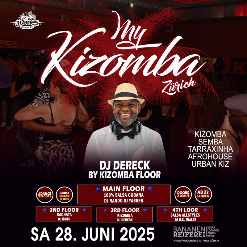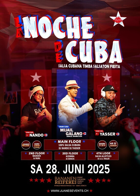 ★ LA NOCHE DE CUBA ★ DJ NANDO DJ YASSER Animation by Mijail Galano Bananenreiferei. SAMSTAG 28. JUNI 2025 ★★★ ● 4 Dance Floors ● AB 22 JAHREN ● DOORS: 21:30 – 04:00 UHR ● EINTRITT CHF 20.- ● GRATIS GARDEROBE ● 400 AUTO PARKPLÄTZE ● EINTRITT: BEZAHLUNG AN DER KASSE NUR BARGELD ● GETRÄNKE-BAR: BARGELD & CREDITCARD ★★★ CUBAN DANCE ANIMATION BY MIJAIL GALANO (Cuba) ★★★ ● 1-MAIN FLOOR: * 100% CUBANO ● DJ NANDO ● DJ YASSER 100% Salsa Cubana, Timba – Rumba - Fiesta ★★★ ● 2ND FLOOR: BACHATA: ● DJ ÑOÑO 100% Bachata Fusion, Moderna, Clasica, del Recuerdo ★★★ ● 3RD FLOOR: KIZOMBA: ● DJ DERECK Kizomba - Semba - Tarraxinha - Afrohouse - Urban Kiz ★★★ ● 4TH FLOOR: SALSA ALLSTYLES ● DJ U.S. THALER Salsa Allstyles, Puertorriqueña, Clasica, Mambo. ★★★ DATES 2025 LA NOCHE DE CUBA ● Sa 26. Juli 2025 ● Sa 23. August 2025 ● Sa 27. September 2025 ● Sa 25. Oktober 2025 ● Sa 22. November 2025 ● Sa 27. Dezember 2025 ★★★ BANANENREIFEREI Pfingstweidstrasse 101 8005 Zürich ★★★ Bienvenidos Juanes Events