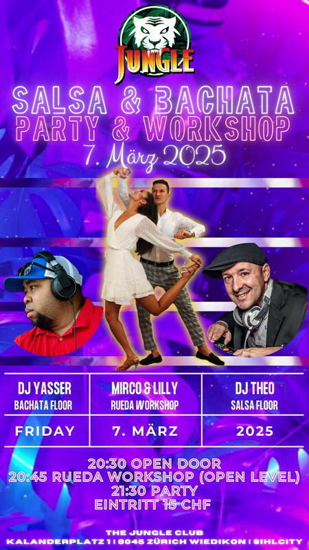 SALSA & BACHATA * WORKSHOP * * 2 DANCE FLOORS * * SALSA & BACHATA * * MIRCO & LILLY * * DJ THEO * * DJ YASSER * Timetable 20:30 Open Door 20:45 Rueda Workshop 21:30 Party Party | Workshop | Rueda 15 CHF Eintritt https://thejungleclub.ch/