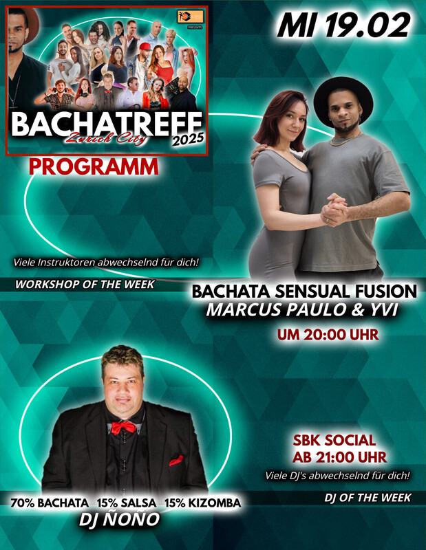 2025 ERWARTET EUCH BACHTREFF IM NEUEN FORMAT! Hola Bachateros & Bachateras! BACHATREFF öffnet seine Türen im neuen Jahr für euch mit einem neuen Konzept. Die Tanzszene in der Schweiz wächst und gedeiht. Es ist uns wichtig, euch die gewohnte Qualität des Events zu bieten, dabei aber auch die Vielfalt des aktuellen Angebots zu unterstützen, einen guten Austausch zwischen den Tänzern zu ermöglichen und auch vielversprechenden neuen Lehrern und Instruktoren die Möglichkeit zu geben, ihr Wissen und ihre Begeisterung für Bachata mit euch zu teilen. WHAT IS NEW: Für die Workshops haben wir viele verschiedene Instruktoren "in round" für euch. Auch für die anschliessende Party werden die DJs im Wochentakt rotieren. Zusätzlich haben wir unsere Preise zurück auf den ursprünglichen Eintrittspreis angepasst. Bachatreff ist ein von Dance Spot Zürich organisiertes Event, welches jeden Mittwoch in Zürich stattfindet. Seit nun bereits mehr als 7 Jahren bringen wir neue Tänzer auf die Tanzflächen. Make it your second home! _________________________________________________________ WOCHENPLAN *************** ° 20:00 SENSUAL FUSION by Marcus Paulo & Yvi _________________________________________________________ ° 21:00 SBK SOCIAL 70% Bachata 15% Salsa 15% Kizomba by DJ Ñoño _________________________________________________________ ° NEUER EINTRITTSPREIS Workshop + Party Pass 25.- Party Pass 10.- _________________________________________________________ ° LOKAL Labor 5 Club Schiffbaustrasse 3 8005 Zurich https://www.facebook.com/share/1AGSoaCtLq/
