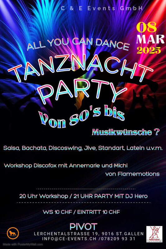 Lasst uns abtanzen und das Leben feiern am Samstag den 08. März im Pivot in St.Gallen mit der neuen Tanznacht Party im Pivot!!! ALL YOU CAN DANCE PARTYNACHT Disco Fox Open Level Workshop mit Annemarie und Michl von 20.00 – 21.00 Uhr Workshop 10 CHF / Party: 10 CHF Eintritt Party ab 21.00 Uhr mit DJ Hero Workshop Anmeldung und Infos: Phone 078 209 93 31 oder per Mail an info@ce-events.ch Wir freuen uns auf einen schönen Abend mit Euch! C & E Events GmbH https://ce-events.ch