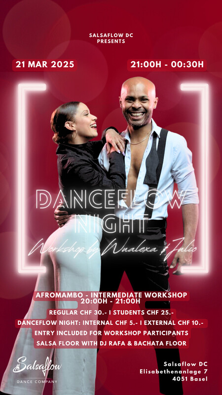 Kommt zu unserer Danceflow Night, in welcher ihr in lockerer Atmosphäre Freunde treffen und miteinander tanzen und üben könnt. Ob Salsa, Bachata oder eine Rueda Cubana, es ist für jeden etwas dabei! Lass Dich von DJ Rafa Rivas auf dem Salsa Floor überraschen. Für den Bachata Floor haben wir eine Playlist, erstellt von unseren Bachateras, welche jede Woche überarbeitet wird. Ihr dürft auch gerne vor Ort eure wünsche anbringen! :) Jeden dritten Freitag im Monat findet noch ein spezieller Workshop statt - mehr Infos auf unserer Website. Afromambo Workshop mit Wualexa & Julio Salsa Floor mit DJ Rafa Rivas & Bachata Floor Preis? Salsaflow Schüler CHF 5.- Externe CHF 10.- 21:00h - 00:30h https://www.salsaflow-dc.com/kurse/workshops/