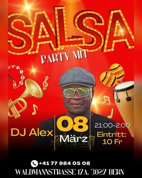 SALSA Party mit DJ ALEX Am 08.03.25 gibt es Salsa mit DJ Alex an der Waldmannstrasse 17A, 3037 Bern. Von 21:00 - 02:00 Uhr wird getanzt…kommt vorbei und geniesst einen schönen Abend. Eintritt: 10 Franken Location: Tram Linie Nummer 8, Haltestelle Tscharnergut Parkplätze im Quartier
