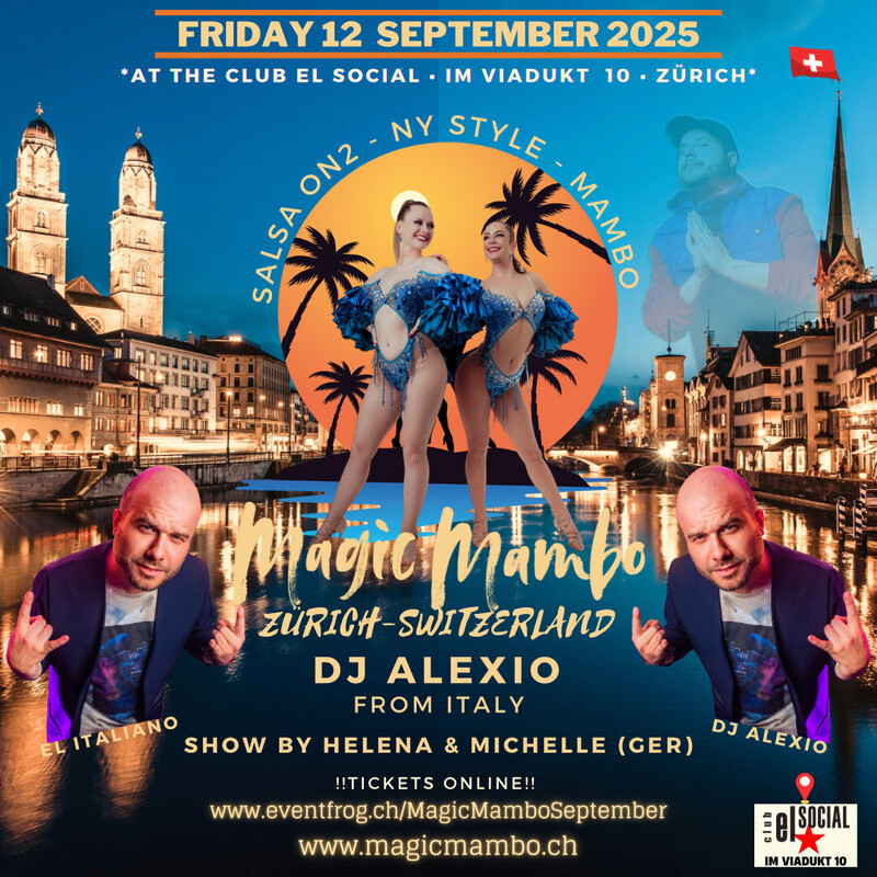 **Salsa On2 - NY Style - Mambo** ----------------- Music by DJ Alexio (Italy) ----------------- Show by Helena & Michelle (Germany) ----------------- Tickets: www.eventfrog.ch/MagicMamboSeptember !Limited Capacity! ----------------- Info: www.magicmambo.ch www.magicmambo.ch
