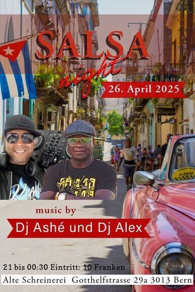 Salsa night in der Alten Schreinerei Salsa night in der Alten Schreinerei geht weiter und lädt am Samstag den 26.04.2015 ab 21 Uhr zum tanzen ein. Ein wunderbarer Abend mit Salsa Musik von Dj Ashé und Dj Alex wartet auf euch. Kommt in die schöne Locationon der Alten Schreinerei in Bern. Eintritt Party: 10 Franken. Location: ALTE SCHREINEREI, Gotthelfstrasse 29a, 3013 Bern facebook, instagram: kizomba bern