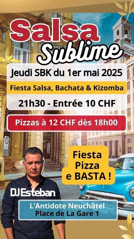 ✅ Jeudi SBK – 1er mai 2025 : Fiesta Salsa, Bachata & Kizomba 📍 À L’Antidote, dans la gare de Neuchâtel 🎉 Offre Spéciale 🍕 Pizzas à 12 CHF dès 18h00 (entrée à la fiesta non comprise) 🎧 DJ Esteban & Friends 🍹 Cocktails savoureux 💃 Entrée 10 CHF (à partir de minuit : 5 CHF) Fiesta, Pizza e BASTA ! --------------- ✅ SBK-Donnerstag, 1. Mai 2025 – Fiesta Salsa, Bachata & Kizomba 📍 Im Antidote, im Bahnhof Neuchâtel 🎧 DJ Esteban & Friends Spezialangebot 🍕 Pizzas ab 18:00 Uhr für nur 12 CHF 🍹 Leckere Cocktails 💃 Eintritt 10 CHF (ab Mitternacht nur 5 CHF)