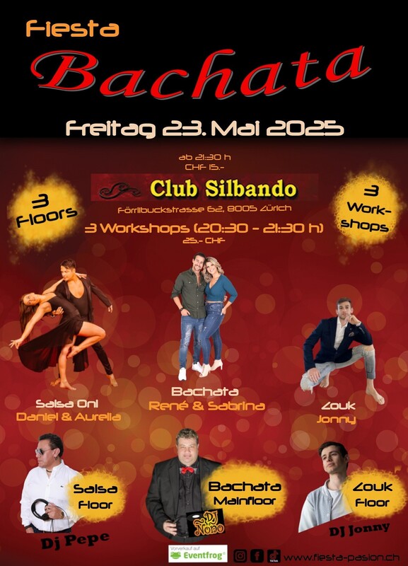 Fiesta Bachata - Deine Social-Dance Party am 4. Freitag des Monates im Club Silbando! Mit 3 Workshops und 3 Floors! Das erwartet dich: *3 Workshops* von 20:30 - 21:30 Uhr (CHF 25.- inkl. Party-Eintritt): - Bachata mit René & Sabrina (Bachata Flow Luzern) https://eventfrog.ch/de/p/kurse-seminare/musik-tanz/bachata-flow-workshop-mit-rene-sabrina-bachata-flow-lu-7324523372334829721.html - Salsa On1 mit Daniel & Aurelia (Wanna Dance Luzern) Vorverkauf: https://eventfrog.ch/de/p/kurse-seminare/musik-tanz/salsa-on1-workshop-mit-daniel-aurelia-wannadance-7324522733248755973.html - Zouk mit Jonny https://eventfrog.ch/de/p/kurse-seminare/musik-tanz/zouk-workshop-mit-jonny-7324523924418514043.html *3 Floors* Party ab 21:30 Uhr (CHF 15.-): - Floor 1: Bachata mit DJ Ñoño - Floor 2: Salsa mit DJ Pepe - Floor 3: Zouk mit DJ Jonny Vorverkauf Workshops und Party-Eintritt via Eventfrog: https://eventfrog.ch/de/p/party/latin-brasil/fiesta-bachata-7324524278963044150.html ●●● WHATSAPP/TELEGRAM: Komm in die WhatsApp- oder Telegram-Gruppe und bleibe über die kommenden Events informiert: Whatsapp: https://chat.whatsapp.com/DHgqcB4Pe8aFmjpYt2v03c Telegram: https://www.t.me/fiestapasion ●●● Fiesta Bachata Daten 2025: jeweils am 4. Freitag des Monates 27.06.2025 Sommerpause 22.08.2025 26.09.2025 24.10.2025 28.11.2025 26.12.2025 ●●● Euer Fiesta Pasion Team #bachata #salsa #dance #bachatasensual #bachatadancing #kizomba #merengue #bachatadance #reggaeton #salsadancing #bachatalove #dancer #music #bachatafusion #dancing #hiphop #dancers #bachatalovers #latindance #bachateros #bachatadominicana #musica #love #baile #socialdance #bachatadancers #latino #salsacubana #dembow #romeosantos