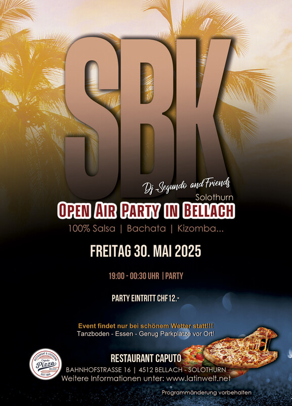 ⚠️ Der Event findet nur bei schönem Wetter statt. 👈🏽 🔥 Frühlings-Salsa und Bachata unter freiem Himmel! 🔥 Damit wir das beste Frühlingswetter nutzen, starten wir früher, ab *19:00 Uhr* geht’s los! 🕠💃🕺 Wir tanzen, solange es draussen angenehm ist – spätestens jedoch bis *00:30 Uhr*. 🌡️ *"Solange die Temperatur mitspielt, halten wir die Tanzfläche heiss!"* Also kommt vorbei, geniesst den Abend und lasst uns gemeinsam die Tanzfläche zum Glühen bringen! 🔥🎶 *PS: Bei unerwarteten Wetteränderungen checkt bitte kurz unsere Kanäle.* es wird immer ab 13.00 Uhr kommuniziert, ob die Party stattfindet oder nicht. Latinwelt präsentieren: ★SBK OPEN AIR PARTY IN BELLACH Tanzfläche Dj Segundo & Friends Salsa, Bachata, Merengue, Cha cha, Kizomba, Son! Zeit zum Geniessen! Zeit zum Feiern! ★Zeit: 19.00 Uhr bis 00:30 Uhr Party ★Preis: CHF 12.- Eintritt Party ★Informationen: - Tanzboden - Essen: Pizza, Pasta, Grill... - Der Event findet nur bei schönem Wetter statt. - 15 Minuten zu Fuss vom bahnhof Bellach - 5 Minuten mit dem Auto von Solothurn - genug Parkplätze vor Ort weitere Informationen unter www.latinwelt.net Anmeldung nicht zwingend.