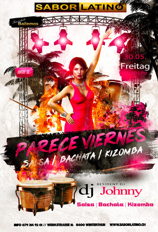 Die richtige Party, um das Wochenende zu beginnen. Mit wechselnden DJ`s immer Salsa, Bachata und Kizomba und auch mal Reggaeton. DJ Johnny: Salsa, Bachata, Kizomba Free Parking vor dem Club und mit dem ÖV ist das Sabor Latino einfach erreichbar bis Haltestelle Grüzenstrasse oder Brücke. Auch die Nachtbusse fahren im 1/2 Stundentakt an und ab diesen Haltestellen. Im Sabor Latino gibt es auch eine Tanzschule: www.bailemos.ch www.saborlatino.ch