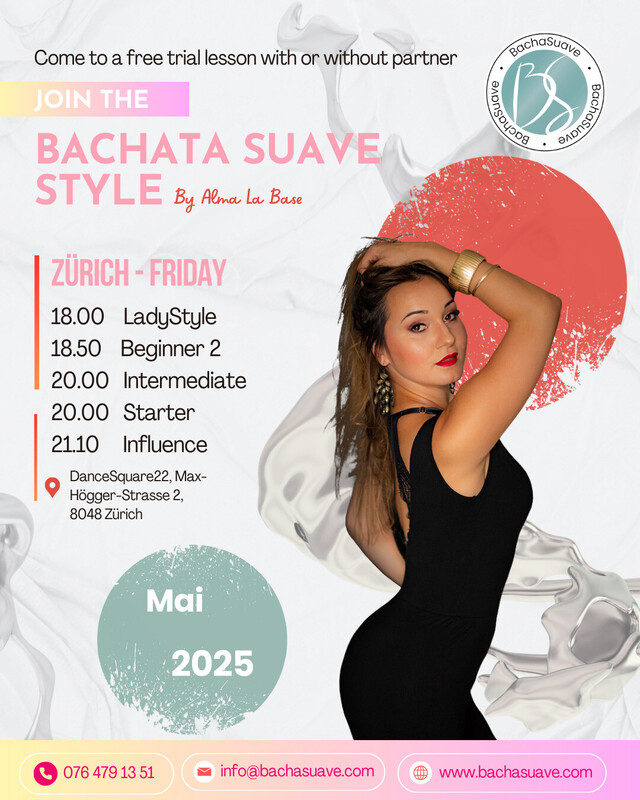 Tanze ins Wochenende – mit Bachata Suave Style in Zürich! Freitagabend wird getanzt! Ob Technik, Ausdruck oder Connection – hier findest du den perfekten Kurs für deinen Stil. Jeden Freitag – DanceSquare22, Max-Högger-Strasse 2, 8048 Zürich • 18:00 Uhr – LadyStyle • 18:50 Uhr – Beginner 2 • 20:00 Uhr – Intermediate (parallel zu Starter) • 20:00 Uhr – Starter (parallel zu Intermediate) • 21:10 Uhr – Influence Class Erlebe Vielfalt, Präzision und Leidenschaft im Bachata Suave Style by Alma La Base – mitten in Zürich. Alle Infos & Anmeldung: www.bachasuave.com WhatsApp: 076 479 13 51 | E-Mail: info@bachasuave.com www.bachasuave.com
