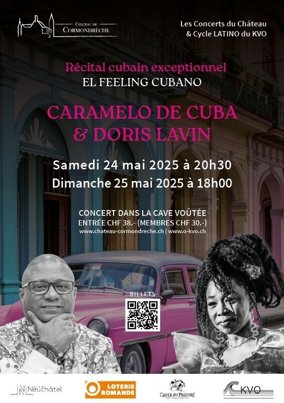 Le KVO & le CHÂTEAU DE CORMONDRÈCHE présentent : EL FEELING CUBANO Récital d’exception au CHÂTEAU DE CORMONDRÈCHE CARAMELO DE CUBA (piano) & DORIS LAVIN (chant) Samedi 24 mai : 20h30 Dimanche 25 mai : 18h00 BILLETTERIE – EN LIGNE : TICKETING INFOMANIAK www.dorislavin.ch