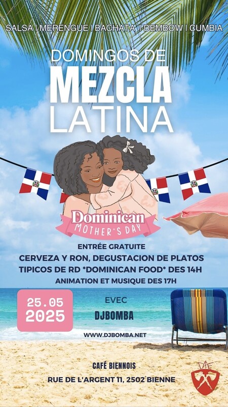 Domingo de mezcla latina No domingo, 25 de mayo, Edición especial Celebración, día de las madres Dominicanas Domingo familiar celebrando el día de las madres con el sabor auténtico dominicano, el sazón de Niní a partir de las 14:00Hr ¡Ven a celebrar y a ganar grandes premios con nosotros! •Rifas y sorteos a partir de las 19:00 Hr • Cubetazos • Especial de Botellas Johnnie Walker y Chivas Música, animación con (DjBomba) *********** Domingos de Mezcla Latina Sunday, May 25th, Special Edition Family Sunday celebrating Dominican Mother's Day with the authentic Dominican flavor, Niní's sazón starting at 14:00Hr. Come celebrate and win great prizes with us! -Raffles and raffles starting at 19:00 Hr. - Cubetazos - Johnnie Walker and Chivas Bottles Special From 5:30 pm. Traditional music, Merengue, Bachata, Salsa, Dembow, Cumbia and more. With (DjBomba) www.djbomba.net