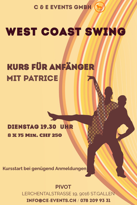 Ich freue mich, wieder West Coast Swing zu unterrichten! Dieser vielseitige Paartanz aus den USA kombiniert fließende Bewegungen mit verschiedenen Musikstilen – von Swing und Blues bis hin zu Pop und Rock. In meinen Kursen kannst du diesen einzigartigen Tanz entdecken. Wir wechseln regelmäßig die Tanzpartner, damit du verschiedene Stile erlebst und dich als Leader oder Follower weiterentwickeln kannst – egal, ob du allein oder mit einem Partner kommst. Wir achten darauf, dass es eine gute Balance zwischen Leadern und Followern gibt, damit jeder optimal lernen kann. Ich freue mich darauf, dich in einem meiner Kurse begrüßen zu dürfen! Ort: Pivot, Lerchentalstrase 19, 9016 St.Gallen Dauer: 8x 75 Min. Kosten: 250 CHF Nur mit Voranmeldung. Info und Anmeldung unter: Info@ce-events.ch oder Phone 078 209 93 31 C & E Events GmbH Team www.ce-events.ch