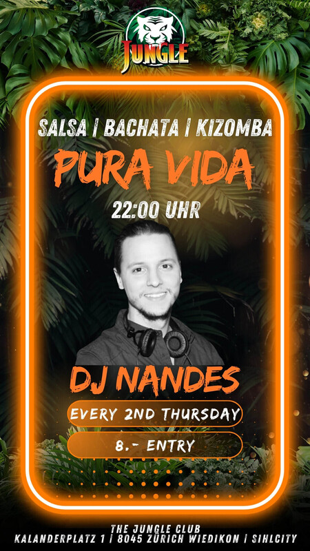 Jeden zweiten Donnerstag Abend wird im The Jungle Club getanzt! Ab 22:00 Uhr spielt DJ Nandes Salsa, Bachata und Kizomba! Erlebe tolle Abende voller positiver Energie und purer Lebensfreude. Wir bieten dir die ideale Gelegenheit, ungestört zu üben, neue Tanzkontakte zu knüpfen und dich mit Gleichgesinnten auszutauschen. Verbringe unvergessliche Stunden mit deinen Liebsten in der einladenden Atmosphäre des The Jungle Club in Zürich Sihlcity. ​Gratis Garderobe Es stehen ca. 60 gratis aussen Parkplätze und das Parkhaus Sihlcity mit über 850 Parkplätze zur Verfügung. Weitere 300 Parkplätze (Saalsporthalle/Allmendstr./Gfellstr./SZU Brunau) in 3-4 Gehminuten für ca. 50Rp-/Stunde. Die aussen Parkplätze an der Hauptstrasse direkt neben dem Einkaufszentrum Sihlcity sind ab 20:00 gratis. Alle anderen aussen Parkplätze sind spätestens ab 22:00 Uhr gratis. Du benötigst mehr Informationen? Gerne kannst du uns über info@thejungleclub.ch kontaktieren.