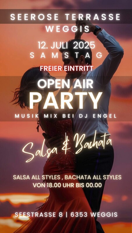 Samstag 12. Juli GRATIS SALSA & BACHATA OPENAIR PARTY MIT DJ ENGEL 19:00h. bis 00:00h & Frei Eintritt Weggis «Perle der Schweizer Riviera» Grosse Dance Floor und nur 50m entfernt von Pavillon am See. Salsa, Bachata von 18 Uhr bis 00.00 Uhr werden von DJ Engel gespielt auf der Terrasse des Post Hotels in Weggis im Restaurant Seerose. TERRASSE RESTAURANT SEEROSE, direkt am See mit Blick auf das traumhafte Alpenpanorama. Freier Eintritt und direkt im Zentrum bei der Schiffstation Weggis POST HOTEL WEGGIS Seestrasse 8, 6353 Weggis Web: https://www.post-hotel-weggis.ch/seerose https://www.facebook.com/hotelrestaurantpohoweggis/ https://fb.me/e/62O3HzKni