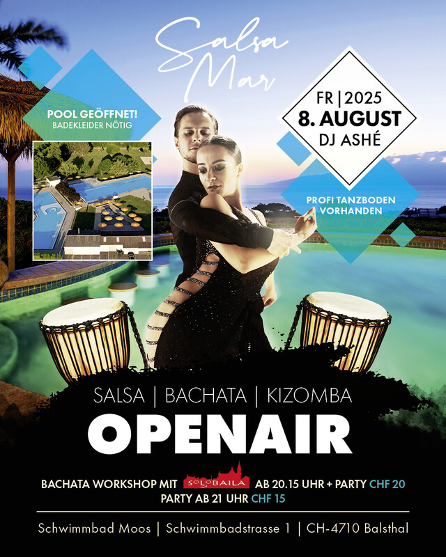 💃Salsa Mar💃Openair. Mit Dj Ashé 💃Salsa Mar💃 On the Road mit. DJ Ashé & Workshop Bachata mit Solobaila. Wir sind wieder in der Badi Balsthal zu Gast, Wir Haben einen Tanzboden sowie Einen Bademeister für euch🌹damit ihr unbeschwert 💃Tanzen könnt💃und frei Baden!!🌹 Also nehmt die Badekleider mit Wir sehen uns hofentlich Bald Lg Euer 💃SalsaMar💃 Haltet euch auf dem laufendem bei Facebook (Salsa Mar)