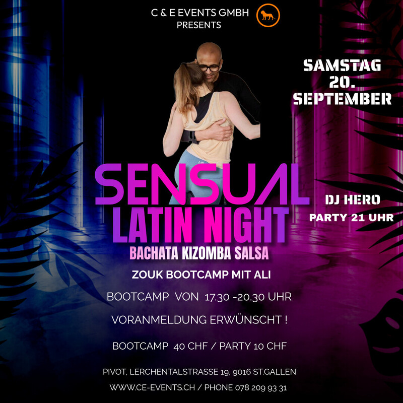 Lasst uns abtanzen und das Leben feiern, am Samstag den 20.September im Pivot in St.Gallen!! Party ab 21.00 Uhr mit DJ Hero Bachata Kizomba Salsa Sensual!! ¨ 2.Floor Zouk Bootcamp mit Ali von 17.30 - 20.30 Uhr Bootcamp 40 CHF / Party: 10 CHF Tickets über eventfrog.ch erhältlich https://eventfrog.ch/de/p/party/latin-brasil/sensual-latin-night-mit-zouk-bootcamp-in-st-gallen-7359654045965892279.html Anmeldung erwünscht!! Teilnehmerzahl begrenzt!! Wir freuen uns auf einen schönen Abend mit Euch! C & E Events GmbH/Pivot www.ce-events.ch