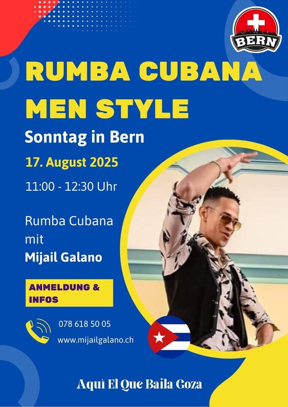 A Rumbearrrr Rumberos Sonntag in Bern Rumba Cubana mit Mijail Galano 11:00 - 12:30 Rumba Cubana Men Style Info & Anmeldung 078 618 50 05 Aquí El Que Baila Goza www.mijailgalano.ch