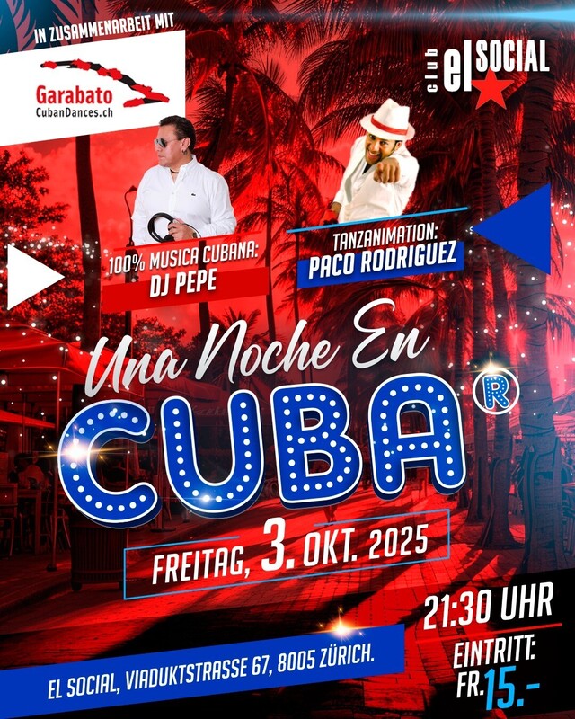 🇨🇺 Una Noche en Cuba® 🇨🇺 Freitag, 3. Oktober 2025 ab 21:30 Uhr 🎶 100 % Música Cubana – pures Karibik-Feeling! 🇨🇺 Ob Timba, Son, Rumba oder Cubaton – unsere Tanzfläche bebt mit den heissesten Rhythmen direkt aus Kuba. Spürt die Energie, tanzt euch frei und lasst euch mitreissen! 🎧 DJ PEPE (BS) – 26 Jahre Leidenschaft am Pult Er ist eine feste Grösse der Schweizer Salsa-Szene: DJ Pepe bringt nicht nur Technik und Know-how mit, sondern auch Herzblut und tiefe Verbundenheit zur lateinamerikanischen Musik. Freut euch auf authentische kubanische Beats, wie man sie nur von ihm bekommt! 💃 Special Tanzanimation mit Paco Rodriguez 🇨🇺 Direkt aus Kuba und längst ein fester Bestandteil der Zürcher Tanzszene: Paco Rodriguez, Leiter der Tanzschule Garabato Cuban Dances, bringt euch mit seiner energiegeladenen Animation in Bewegung – und sorgt garantiert für Partystimmung im El Social! Vamos a bailar – wir sehen uns auf der Tanzfläche! 📍 Ort: El Social in Zürich 📍 Viaduktstrasse 67, 8005 Zürich Eintritt Party: Fr. 15.-