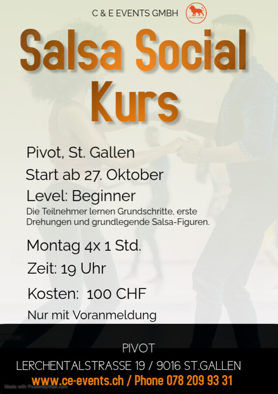 Neu : Salsa Social Anfänger Kurs – Pivot St.Gallen • Kurs: Salsa-Anfänger • Ort: Pivot St.Gallen • Montag um 19:00 Uhr • Dauer: 4 x 1 Stunde • Kosten: 100 CHF • Anmeldung: Kurs nur mit Voranmeldung Tauche ein in die lebendige Welt des Salsa Social! Unser Anfänger-Kurs Salsa Social richtet sich an alle, die etwas Grundkenntnisse im Salsa haben oder ganz neu in Salsa Social einsteigen möchten. Über vier spannende Einheiten lernst du Grundschritte, erste Drehungen und grundlegende Salsa-Figuren und festigst dein Timing und fühlst dich sicherer. Der Kurs bietet dir die perfekte Gelegenheit, deine Salsa Social Basics in einer freundlichen und motivierenden Atmosphäre zu erarbeiten. Wir freuen uns auf schöne Tanzstunden mit euch!!! www.ce-events.ch