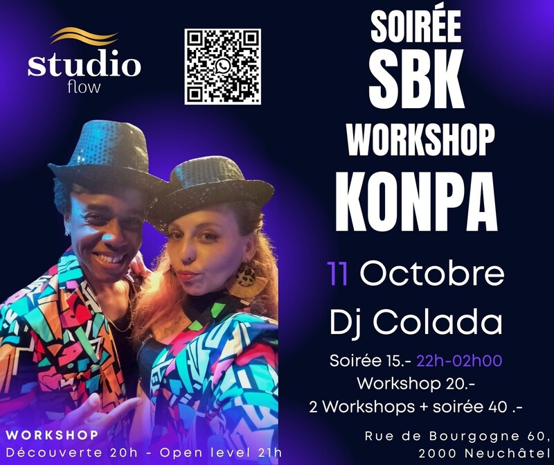 🎊 LA MENSUELLE 🟠 SOIREE /SBK // WORKSHOP KONPA avec SYAKA & JOSUÉ ! 📅 SAMEDI 11 OCTOBRE 2025 20h - 21h Konpa dirèk : open level 21h - 22h Konpa gouyad : Open level 22h - 02h Soirée /SBK avec Dj Colada❤️‍🔥 🟠 Pour cette première soirée mensuelle depuis la reprise nous vous proposons une spéciale: une soirée qui mélangera le style Konpa et du traditionnel SBK que vous connaissez tous ☺️ 2 Workshops vous sont proposés Konpa dirèk : style haïtien de danse et de musique né dans les années 50, venant principalement de la danse traditionnelle haïtienne le Merengue et inspiré de figure de salsa. Le konpa est caractérisé par un rythme cadencé, élégant et fluide, où le couple danse en connexion rapprochée ou éloignée. Konpa gouyad : évolution plus sensuelle du konpa, mettant l’accent sur les mouvements de bassin, la lenteur et l’expression corporelle. Elle peut être aussi improvisée et inspirée suivant le ressenti de la musique. Syaka et Josué, originaires de l’île Maurice et d’Haïti sont des danseurs internationaux très humanistes. La connexion entre ces deux personnes et le Studio Flow s’est très vite faite 🫶🏼 🕺🏾 Josué est professeur de konpa, compositeur international et musicien professionnel. 💃🏽 Syaka est chorégraphe internationale, chanteuse, professeure de danse latino-tropicale (salsa, bachata, kizomba, konpa, tropical heels, zouk brésilien, zouk caraïbe, Maloya). Elle est également ancienne danseuse performer de David Guetta notamment lors de l'Euro2016 au stade de France 🔥 TARIFS: 1 Workshop: 20 CHF Soirée seul: 15 CHF 2 Workshops + soirée: 40 CHF Viens profiter des workshops et/ou de la soirée au Studio Flow 📍 Rue de Bourgogne 60, 2000 Neuchâtel ☑️ Pas d’inscription nécessaire ☑️ Tarif spécial pour workshops + soirée ☑️ Bar à cocktails ouvert dès 22h00 Si tu as des questions écris-nous en mp, toute l’équipe du Studio Flow est à ta disposition 🤗