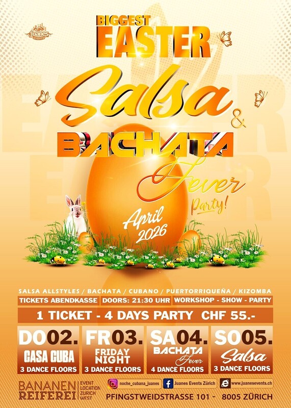 ❀ BIGGEST EASTER SALSA & BACHATA FEVER PARTY OF SWITZERLAND in BANANENREIFEREI ❀ ❀ 1 TICKET 4 TAGE PARTY ❀ DO 02. - FR 03. - SA 04. - SO 05. - APRIL 2026 ❀ SPECIAL EASTER DECORATION ❀❀❀ PARTY PASS: NUR ABENDKASSE CHF 55.- Inkl Alle 4 Tage Party + Garderobe ❀❀❀ ❀ EINTRITT: BEZAHLUNG AN DER KASSE MIT BARGELD Du kannst Deinen PARTY PASS für alle 4 Tage am Donnerstag 02.04.25 an der Kasse der Bananenreiferei für CHF 55.- kaufen. Du erhältst eine Karte für alle 4 Tage, die Du am Freitag, Samstag und Sonntag an der Kasse jeweils mit Deinem Ausweis vorzeigen musst, damit Du ohne Probleme reinkommst. ❀❀❀ Willkommen zum SALSA -CUBA-BACHATA- KIZOMBA OSTER PARTY, 4 Tage gute Parties, Non Stop in der Bananenreiferei, Wir wissen, dass wir den besten Club für Tänzer haben, grosse Terrasse, Parkplätze für mehr als 300 Autos im selben Club, beste Tanzflächen für alle Geschmäcker und das Beste von allem, wir haben die besten DJS von Salsa, Cuba, Bachata, Kizomba, die die besten Hits von gestern und heute liefern werden. ❀❀❀❀❀❀❀❀❀❀❀❀❀ ❀❀❀❀❀❀❀❀❀❀❀❀❀ ❀ PROGRAM FREITAG 03. APRIL 2026 ❀ 3 DANCE FLOORS ❀ SALSA FRIDAY NIGHT ❀ Doors 21:30 bis 03:00 Uhr ❀ Abendkasse CHF 15.- inkl. Garderobe (selfservice) ●●● ❀ MAIN FLOOR: SALSA ALLSTYLES ❀ 368 M² DANCE FLOOR ❀ DJ RUMBERO ❀ DJ ●●● 2ND FLOOR: 100% BACHATA ❀ DJ ●●● 3RD FLOOR: KIZOMBA ❀ DJ ●●● 4TH FLOOR: ❀❀❀❀❀❀❀❀❀❀❀❀❀ ❀❀❀❀❀❀❀❀❀❀❀❀❀ ❀ PROGRAMM SAMSTAG 04. APRIL 2026 ❀ BACHATA FEVER ❀ 4 DANCE FLOORS ❀ Doors Party 21:30 bis 04:00 Uhr ❀ Abendkasse CHF 20.- inkl. Garderobe ●●● 20:30 UHR, BACHATA WORKSHOP . WORKSHOP BY BACHATA . Stye: . Label: ● Sie brauchen nicht zu buchen, kommen Sie direkt zum Bananenreiferei am Samstag 04 April 26 um 20:15 Uhr. Der Workshop Preis ist CHF 25.- Inkl. Garderobe & Party auf 4 Dance Floors. ● EINTRITT: BEZAHLUNG AN DER KASSE NUR BARGELD ●●● 00:00 BACHATA SHOW BY ●●● ❀ MAIN FLOOR: BACHATA FEVER. ❀ 368 M² 100% Bachata Floor ❀ DJ ❀ DJ 100% Bachata Fusion / Sensual / Moderna / Clasica / Del Recuerdo ●●●● 2ND FLOOR: 100% CUBANO ❀ DJ RUMBERO ●●●● 3RD FLOOR: KIZOMBA ❀ DJ ●●●● 4TH FLOOR: SALSA ALLSTYLES ❀ DJ ❀❀❀❀❀❀❀❀❀❀❀❀❀ ❀❀❀❀❀❀❀❀❀❀❀❀❀ ❀ PROGRAMM SONNTAG 05. APRIL 2026 ❀ 3 DANCE FLOORS ❀ SALSA ALLSTYLES ❀ Doors 21:30 bis 04:00 Uhr ❀ Abendkasse CHF 20.- inkl. Garderobe ❀ MAIN FLOOR: SALSA ALLSTYLES ❀ 368 M² DANCE FLOOR ❀ DJ RUMBERO ❀ DJ Salsa Allstyles, Cubano, Puertorriqueña, Clasica, del Recuerdo ●●● 2ND FLOOR: 100% BACHATA ❀ DJ ●●● 3RD FLOOR: KIZOMBA ❀ DJ ❀❀❀❀ AUF DEM DACH DES BANANENREEIEREI HABEN WIR PARKPLÄTZE FÜR 300 AUTOS. ●●● LOCATION: BANANEREIFEREI Pfingstweidstrasse 101 8005 Zürich ●●● Beinvenidos Juanes Events https://juanesevents.ch/2-0-Events.html