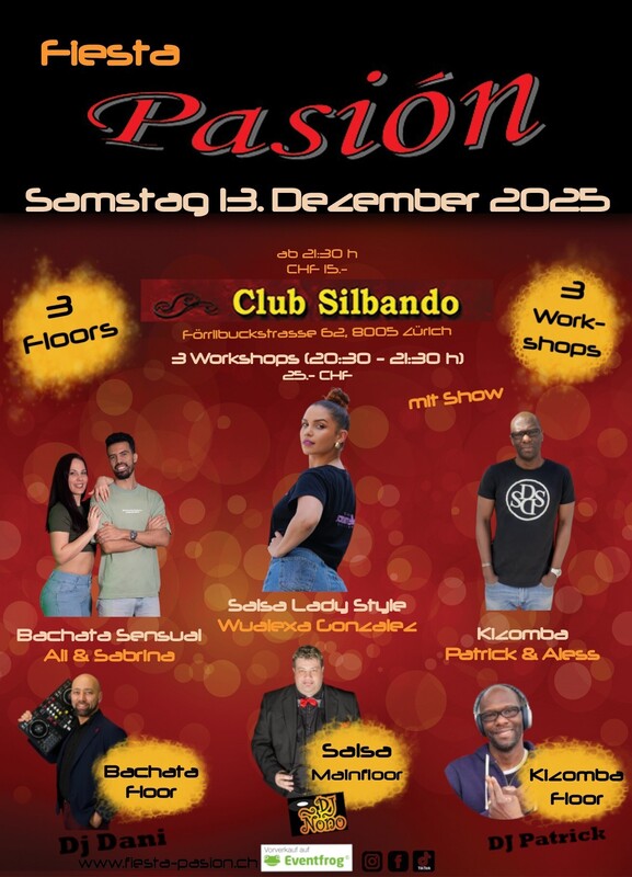 Fiesta Pasión - Deine Social-Dance Party am 2. Samstag des Monates im Club Silbando! Mit 3 Workshops und 3 Floors und Show! Das erwartet dich... *3 Workshops*: Vor der Party finden von 20:30 - 21:30 Uhr drei Workshops statt (CHF 25.- inkl. Party-Eintritt): - Salsa Lady Style mit Wualexa Gonzalez Vorverkauf: https://eventfrog.ch/de/p/kurse-seminare/musik-tanz/salsa-lady-style-workshop-mit-wualexa-gonzalez-7391193049928359635.html - Bachata Sensual mit Ali & Sabrina (BailAdoro) Vorverkauf: https://eventfrog.ch/de/p/kurse-seminare/musik-tanz/bachata-sensual-workshop-mit-ali-sabrina-bailadoro-7391197162774777909.html - Kizomba mit Patrick & Aless Vorverkauf: https://eventfrog.ch/de/p/kurse-seminare/musik-tanz/kizomba-workshop-mit-patrick-aless-7391192708805574247.html *3 Floors*: - Floor 1: Salsa mit DJ Ñoño - Floor 2: Bachata mit DJ Dani - Floor 3: Kizomba mit DJ Patrick *Show* - 23:45 Uhr (Saal 1 - Salsa Floor): - "Caramelo" Ladies Team by Wualexa Gonzalez Abendkasse 15.- CHF ------------------------------ WHATSAPP/TELEGRAM: Komm in die WhatsApp- oder Telegram-Gruppe und bleibe über die kommenden Events informiert: Whatsapp: https://chat.whatsapp.com/DHgqcB4Pe8aFmjpYt2v03c Telegram: www.t.me/fiestapasion ------------------------------ Fiesta Pasión Daten 2026: (jeweils am 2. Samstag des Monates) 10.1.2026 14.2.2026 14.3.2026 11.4.2026 9.5.2026 13.6.2026 11.7.2026 Sommerpause 12.9..2026 10.10.2026 (19-jähriges Jubiläum) 14.11.2026 12.12.2026 ------------------------------ Dein Fiesta-Pasión Team #salsa #bachata #dance #salsadancing #music #a #salseros #merengue #kizomba #colombia #salsacubana #reggaeton #dancer #salsadance #puertorico #bachatasensual #salsamusic #dancing #musica #hiphop #rumba #salsaromantica #mambo #cuba #dancers #salsaon #venezuela #latino #latindance #love
