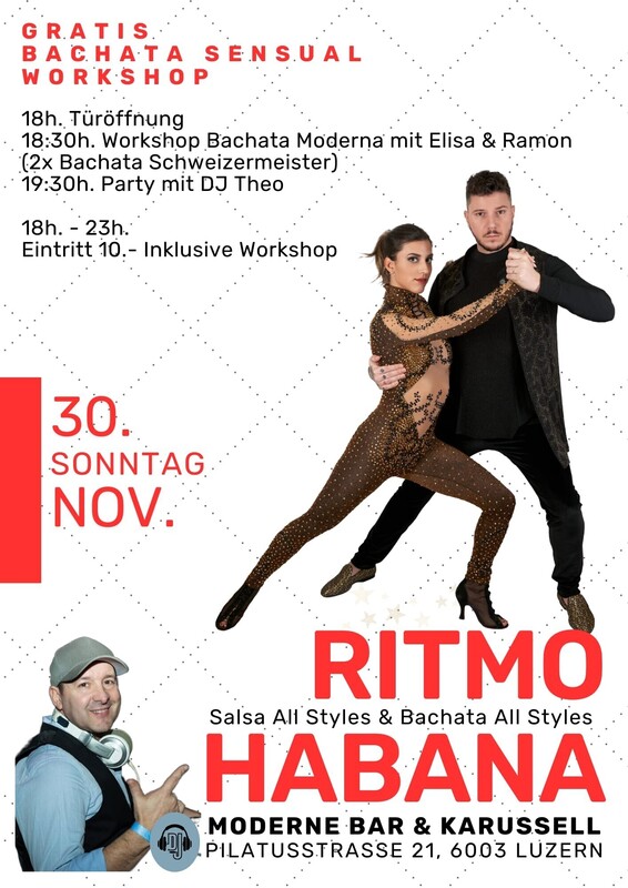 im Zentrum von Luzern ★ JEDEN SONNTAG ★ 18:00 Uhr bis 23:00 Uhr ★ RITMO HABANA ★ Salsa Cubana & Salsa Puertoriqueña, Bachata all Styles, Son & Cha Cha mit DJ Theo -------------------------------------------------------- PROGRAMM: > 18:00 Uhr Türöffnung und Musik mit DJ Theo > 18:30 Uhr Workshop Bachata Moderna mit Elisa & Ramon ( 2x Schweizermeister ) > 19:30 Uhr Party mit DJ Theo > 23:00 Uhr Party Ende --------------------------------------------------------- 18.00 Uhr bis 23.00 Uhr I Eintritt 10.- (NUR BARZAHLUNG) Im MODERNE trifft man sich an der Bar oder im Karussell im ehemaligen Kinosaal. MODERNE BAR & KARUSSELL Pilatusstrasse 21, 6003 Luzern, www.modernekarussell.ch ---------------------------------------------------------- WIE FINDEN SIE UNS: ------------------------- AUTO: Parkhaus Kantonalbank, 100 Meter Bahnhofparking P1+P2, 200 Meter BUS: Buslinie Nr. 1 ab Bahnhof Luzern - Kantonalbank (1 Station) ZUG: 200 Meter, vier Gehminuten ab Hauptbahnhof Luzern https://fb.me/e/6M7x9NaJX