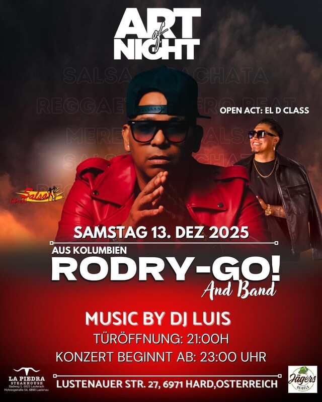 Erlebe eine unvergessliche Nacht voller Musik und Tanz! Aus Kolumbien kommt Rodry-GO und seine Band ! Begleitet wird der Abend mit DJ Luis und einem besonderen Open Act : El D Class. Datum: 13.Dezember 2025 Location: Art of Night, Lustenauerstrasse 27, 6971 Hard Österreich Türöffnung: 21.00 Uhr Konzertbeginn: 23.00 Uhr Musikrichtungen: Salsa, Bachata, Merengue und vieles mehr.... Vorverkauf: 16 Euro Abendkasse: 20 Euro Vorverkauf Ticket bei Eventfrog zu Erhalten. https://eventfrog.at/de/p/konzert/latin/rodry-go-and-band-7390094765885254821.html