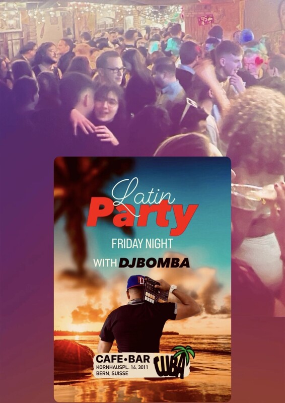 Ab 22:30 Salsa, Bachata, Merengue, Reggaeton Kizomba 💃🏻🕺🏽 00:30 Start Party🎉🎉 Hits latino, Dembow, Afro, Reparto Kuduro, Baile Funk, R&B, Latin House 🔥🔥 Mit DjBomba