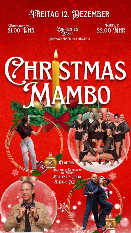 Christmas Mambo 🎄✨ – Die Weihnachtsparty im Corrientes Am Freitag, den 12. Dezember, laden wir euch herzlich zum Christmas Mambo ein! Wir feiern die schönste Zeit des Jahres mit feinster Musik und toller Gesellschaft. Musikalisch dreht sich alles um Salsa Mambo & New York Style – aufgelegt von Will El Otro DJ. Wichtig: Alle sind willkommen! Egal welchen Stil ihr tanzt, die Freude an der Musik und dem gemeinsamen Tanzen steht im Vordergrund. Kommt vorbei und genießt die tolle Atmosphäre im Corrientes. 💃 DER WORKSHOP (21:00 – 22:00 Uhr) ✨ Claudia (Salsa Flow DC) unterrichtet einen Workshop zum Thema Bodymovements. Perfekt, um euren Körper zu isolieren, den Rhythmus besser zu spüren und euren eigenen Style auf das nächste Level zu bringen. 🎉 DIE PARTY (ab 22:00 Uhr) Nach dem Workshop übernimmt Will El Otro DJ das Pult. Zwischendurch erwarten euch zwei spektakuläre Shows: ✨ Wualexa & Julio ✨ Bailarico Ladiesteam by Vesna 📍 LOCATION: Corrientes (Gundeldingerfeld, Halle 2) Dornacherstrasse 192, Basel 🎫 EINTRITT: Workshop + Party: CHF 25.- Nur Party: CHF 15.- Schnappt euch eure Tanzschuhe und lasst uns den besonderen Abend gemeinsam geniessen. Wir freuen uns auf euch! #ChristmasMambo #SalsaBasel #Corrientes #SalsaFlowDC #Bodymovement #SalsaMambo #AllStylesWelcome #TanzenInBasel #Bailarico #Caramelodancecompany Wenn der Adventskranz leuchtet und die Mambo-Beats erklingen, ist es Zeit für Christmas Vibes pur! https://www.facebook.com/events/839787835247436
