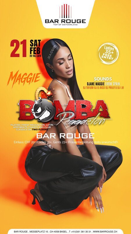 Am Samstag, den 21. Februar 2026 startet Bomba Reggaeton in die nächste Runde auf 105 Meter in der Bar Rouge. Beim Take Off mit an Bord sind DJane Maggie aus Spanien sowie DJs El Ricci, Tuflow und Philly. Das Ganze gehostet von zwei der erfahrensten Veranstaltern von Basel; Bar Rouge & Bomba Reggaeton. https://eventfrog.ch/BombaReggaeton21022026