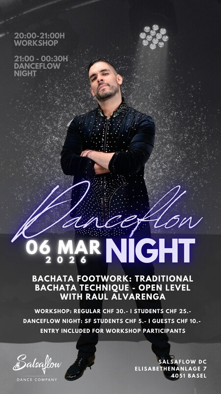Kommt zu unserer Danceflow Night, in welcher ihr in lockerer Atmosphäre Freunde treffen und miteinander tanzen und üben könnt. Ob Salsa, Bachata oder eine Rueda Cubana, es ist für jeden etwas dabei! Lass Dich von DJ Rafa Rivas auf dem Salsa Floor überraschen. Für den Bachata Floor haben wir eine Playlist, erstellt von unseren Bachateras, welche jede Woche überarbeitet wird. Ihr dürft auch gerne vor Ort eure wünsche anbringen! :) Jeden dritten Freitag im Monat findet noch ein spezieller Workshop statt - mehr Infos auf unserer Website. Salsa Floor mit DJ Rafa Rivas & Bachata Floor Preis? Salsaflow Schüler CHF 5.- Externe CHF 10.- 21:00h - 00:30h