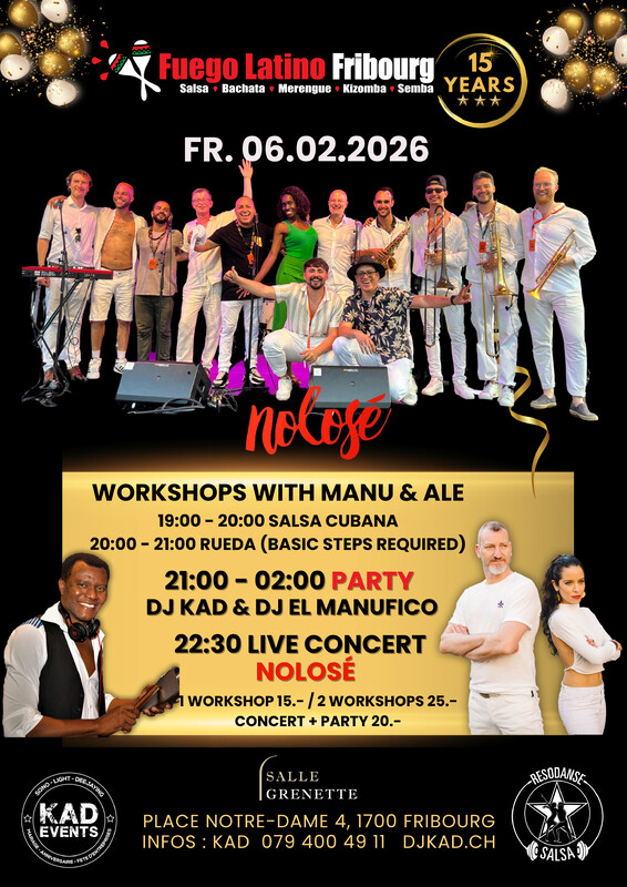 Fuego Latino Nolosé en concert Live - Workshops - Party A l'occasion de la 15ème anniversaire, Fuego Latino Fribourg vous invite Vendredi 6 février 2026 à une belle soirée : ░░░░░░░░WORKSHOPS avec MANU & ALE░░░░░░░░ ★★ 19h à 20h - Salsa Cubana ★★ 20h à 21h - Rueda de Casino (pas de base requis) ░░░░░░░░CONCERT LIVE : GRUPE NOLOSÉ░░░░░░░░ Dès 22h30 concert avec le Groupe Nolosé. ░░░░░░░░21H - 02H PARTY░░░░░░░░ ★★Dj Kad & Dj El Manufico Salsa & Bachata avant et après le concert ░░░░░░░░PRIX░░░░░░░░ ★★1 Workshop 15.- / 2 Workshops 25.- / Concert + party 20.- ░░░░░░░░ADRESSE░░░░░░░░ Salle Grenette, Place Notre-Dame 4, 1700 Fribourg ░░░░░░░░INFOS░░░░░░░░ Infos : Kad 079 400 49 11 - www.djkad.ch www.djkad.ch