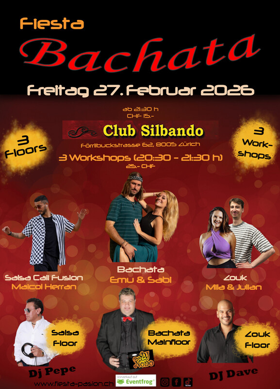 Fiesta Bachata - Deine Social-Dance Party am 4. Freitag des Monates im Club Silbando! Mit 3 Workshops und 3 Floors! Das erwartet dich: *3 Workshops* von 20:30 - 21:30 Uhr (CHF 25.- inkl. Party-Eintritt): - Bachata mit Emu & Sabi Vorverkauf: https://eventfrog.ch/de/p/kurse-seminare/musik-tanz/bachata-workshop-mit-emu-sabi-7411902855974497804.html - Salsa Cali Fusion mit Maicol Herran (PasoLatino) Vorverkauf: https://eventfrog.ch/de/p/kurse-seminare/musik-tanz/salsa-cali-fusion-workshop-mit-maicol-herran-pasolatino-7411901253255442454.html - Zouk Workshop - Travelling the Room mit Mila & Julian Vorverkauf: https://eventfrog.ch/de/p/kurse-seminare/musik-tanz/zouk-workshop-travelling-the-room-mit-mila-julian-7411902190028117143.html *3 Floors* Party ab 21:30 Uhr (CHF 15.-): - Floor 1: Bachata mit DJ Ñoño - Floor 2: Salsa mit DJ Pepe - Floor 3: Zouk mit DJ Dave Abendkasse: 15.- CHF Vorverkauf Workshops und Party-Eintritt via Eventfrog: https://eventfrog.ch/de/p/party/latin-brasil/fiesta-bachata-7411903033792021972.html ●●● WHATSAPP/TELEGRAM: Komm in die WhatsApp- oder Telegram-Gruppe und bleibe über die kommenden Events informiert: Whatsapp: https://chat.whatsapp.com/DHgqcB4Pe8aFmjpYt2v03c Telegram: https://www.t.me/fiestapasion ●●● Fiesta Bachata Daten 2026: (jeweils am 4. Freitag des Monates) - 23.1.2026 - 27.2.2026 - 27.3.2026 - 24.4.2026 - 22.5.2026 - 26.6.2026 Sommerpause im Juli - 28.8.2026 - 25.9.2026 - 23.10.2026 - 27.11.2026 - 25.12.2026 ●●● Euer Fiesta Pasion Team #bachata #salsa #dance #bachatasensual #bachatadancing #kizomba #merengue #bachatadance #reggaeton #salsadancing #bachatalove #dancer #music #bachatafusion #dancing #hiphop #dancers #bachatalovers #latindance #bachateros #bachatadominicana #musica #love #baile #socialdance #bachatadancers #latino #salsacubana #dembow #romeosantos