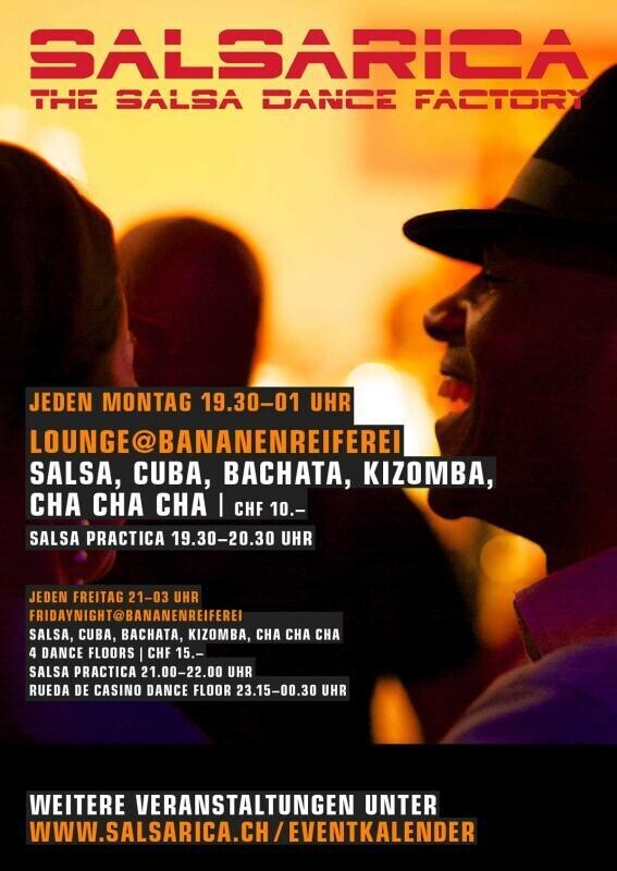 Jeden Montag 19:30 - 01:00h Salsa, Bachata, Cha-Cha-Cha, Son Türöffnung 19:30 Uhr Entry CHF 10.- (inkl. SalsaPractica) 370m2 Dancefloor / Lounge & Bar Programm: 19:30 - 20:30 Uhr SalsaPractica mit Tanzlehrer Ab 20:30 Uhr Main Floor DJ Saltho Salsa, Bachata, Cha-Cha-Cha, Son - das sind die richtigen Rhythmen, für einen schwungvollen Start in eine neue Woche. Komm am Montag zum Salsa-Tanzabend der SalsaRica in die Bananenreiferei. Bis 01.00 Uhr in die Nacht könnt ihr voller Freude das Tanzbein schwingen. SalsaPractica Es ist keine Kursstunde, sondern gedacht, um Knöpfe zu lösen oder Figuren zu üben die noch nicht so ganz gelingen. Es wird langsame Musik abgespielt, perfekt um zu üben. Lehrer sind vor Ort zur Beratung und Einstufung. Die Salsa Practica ist nicht gratis, sondern ein Bestandteil von der Party und im Partyeintritt inbegriffen. Practica Lehrer erkennt man an speziellen T-Shirts oder ein Schlüsselanhängern. Geht gerne aktiv auf die Lehrer zu, wenn Hilfe gebraucht wird. Man kann auch einfach kommen zum selber üben.